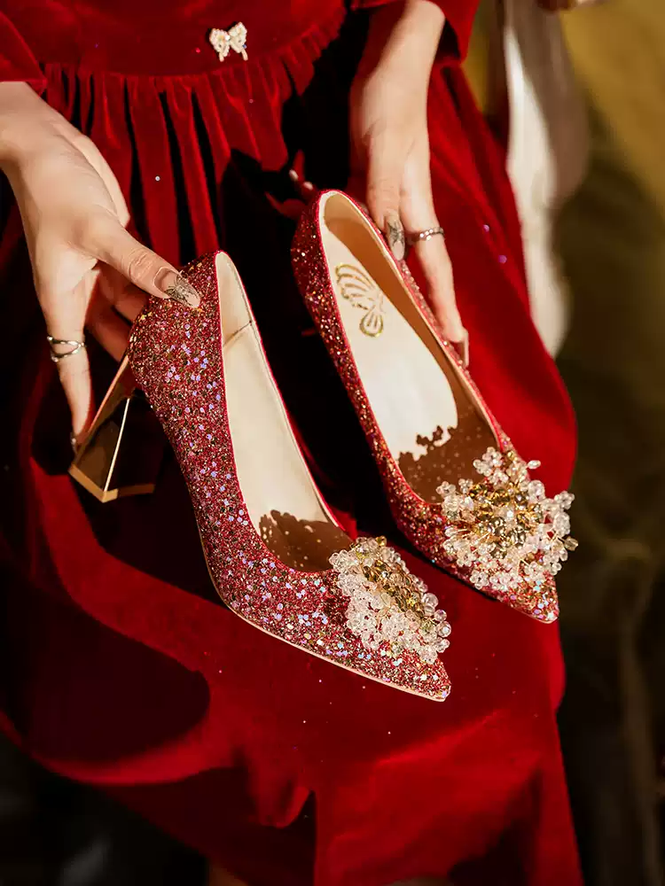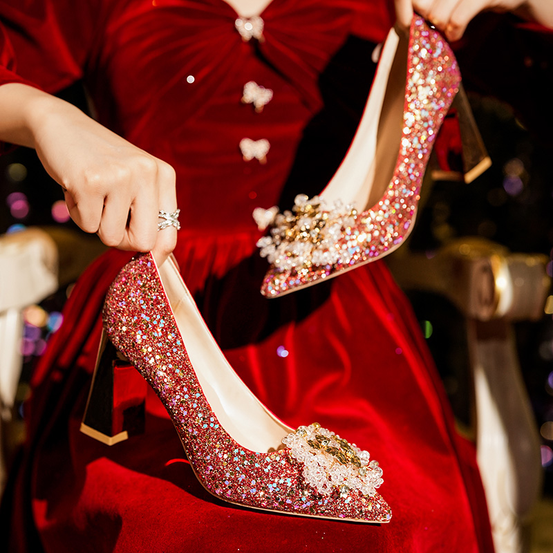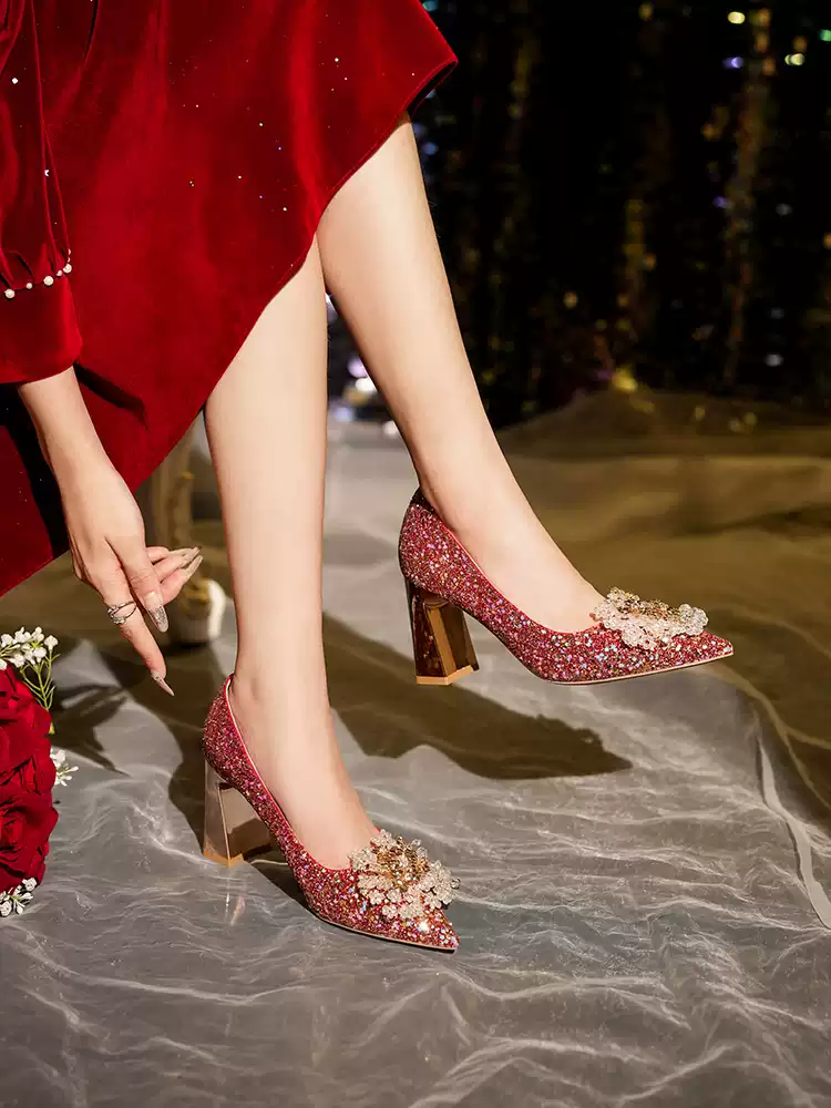 Wedding shoes for women thick heels 2025 spring new Chinese style Xiuhe dress main wedding dress bridal shoes red high heels do not tire fe