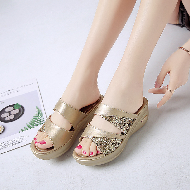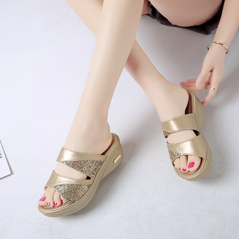 Women’s sandals for summer outdoor wear fashion 2022 new thick-soled platform wedge heels for ladies easy to match fish-mouth sequined slippers for women